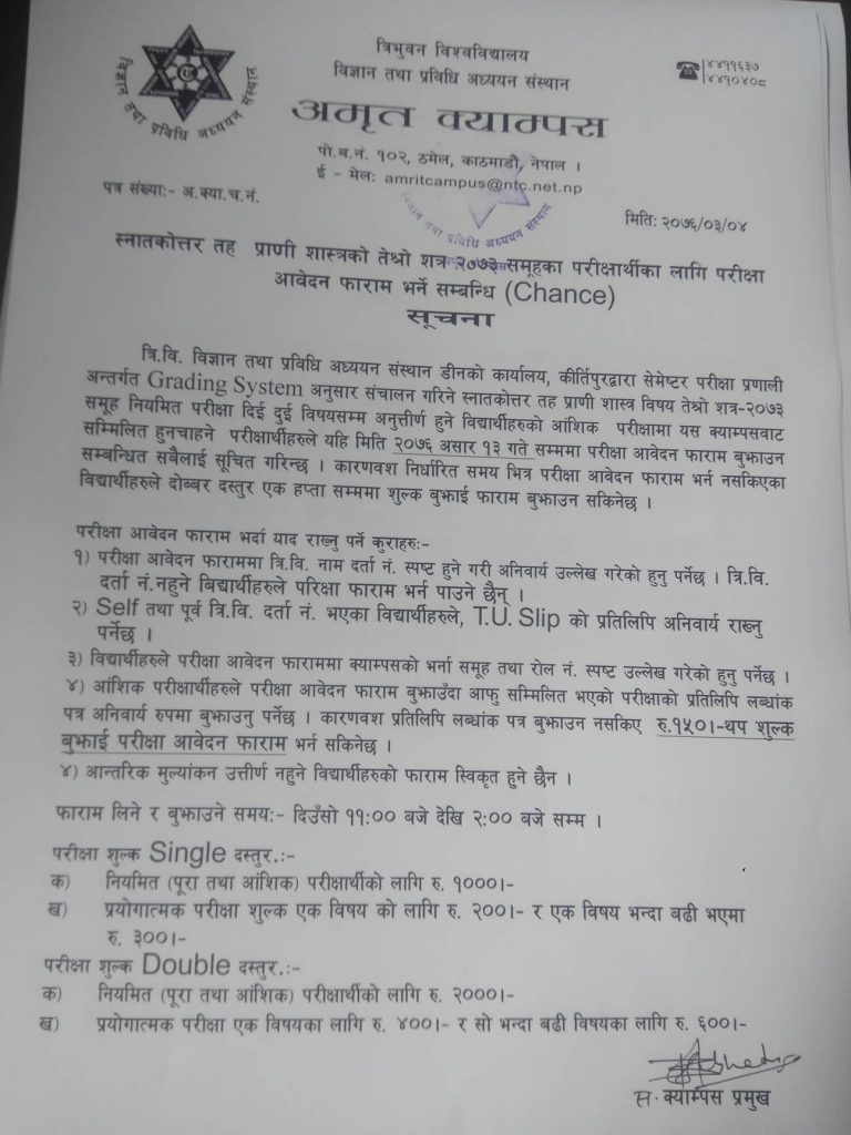 Notice – Exam form fillup for MSc Zoology 3rd semester | Amrit Campus